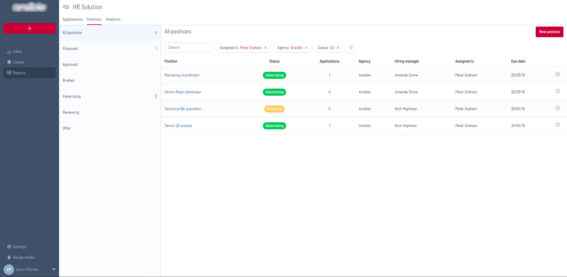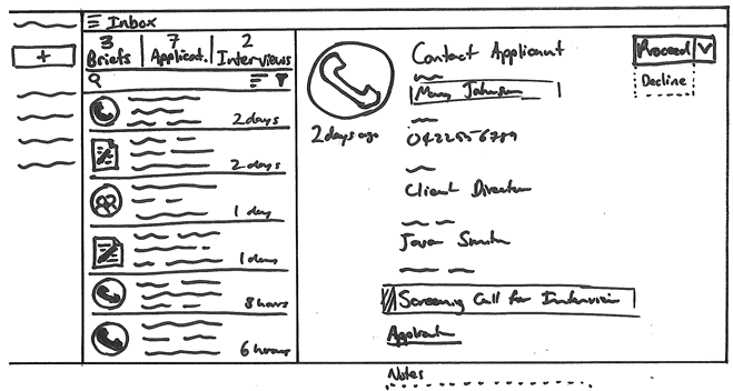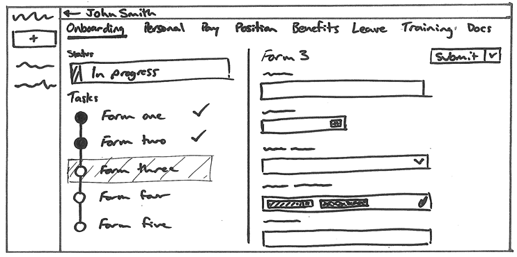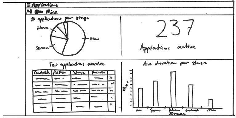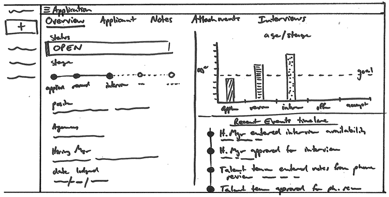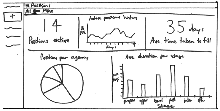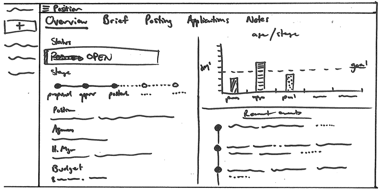 Following the input from more in-depth research, I led a co-design workshop which produced a single overall solution with high level architecture and proposed data objects, concept sketches and wireframes produced. These highlighted the dashboards which would display the process information and the completion of each positions hiring process, and each applicants progression.